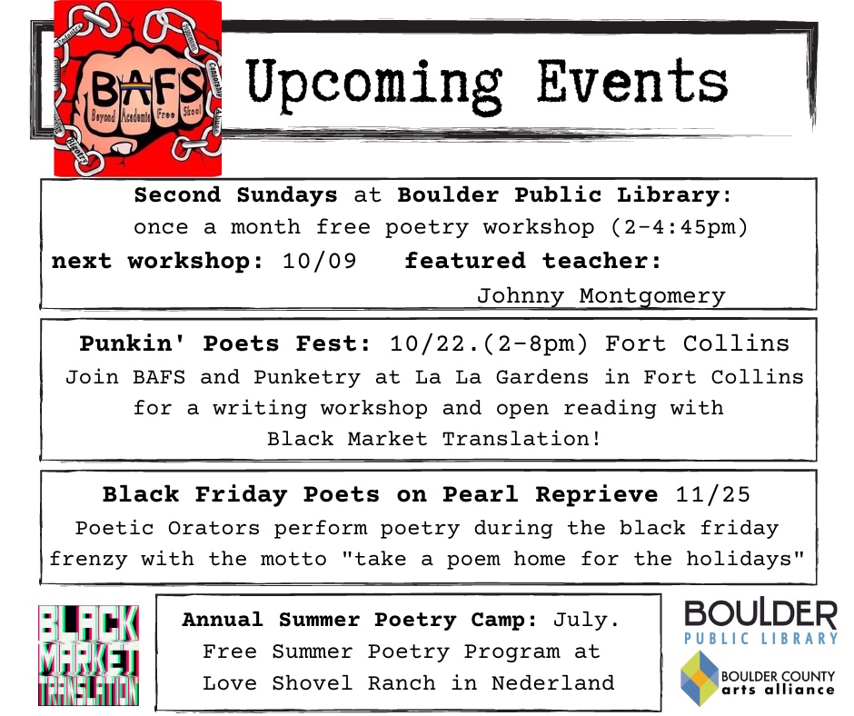 Although it may come across that way to some, BAFS is not all “bad kids” drinking out of flasks in detention doodling haikus on our notebooks (that’s just study hall). Beyond Academia Free Skool is an anarchist writers collective founded as a response to inequities in higher education that limit the voices which are represented in academic poetics. We are dedicated to 100% free to the public literary and performance art education and events. BAFS was founded in 2012 by Marcus If, has been fiscally sponsored by the Boulder County Arts Alliance since 2017, and a sponsored Boulder Public Library program since 2018.