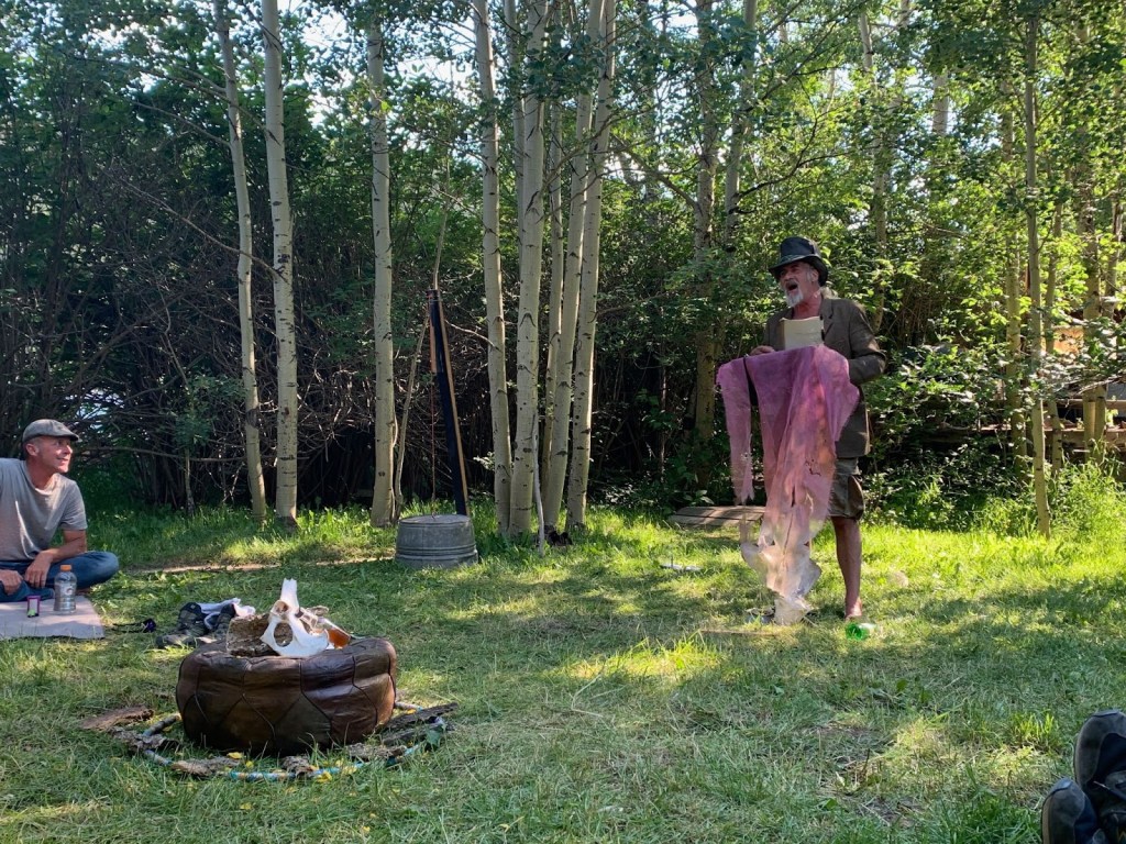 On the final day of BAFS Camp, the graduation ceremony commenced. During the ceremony we sat in the aspen tree grove at Love Shovel Ranch around a centerpiece shrine made of a leather ottoman surrounded by sun rays of bark and a hula hoop topped with natural materials, a skull, and soon an empty bottle of whiskey flipped on it’s side. A ripped piece of pink fabric adorned the podium stand and blew in the wind as poets stood behind it for the open reading. There were retirement speeches and acceptance speeches, which are woven together with footage from camp, and can be viewed here: https://fb.watch/fC2QWwVGJ-/
