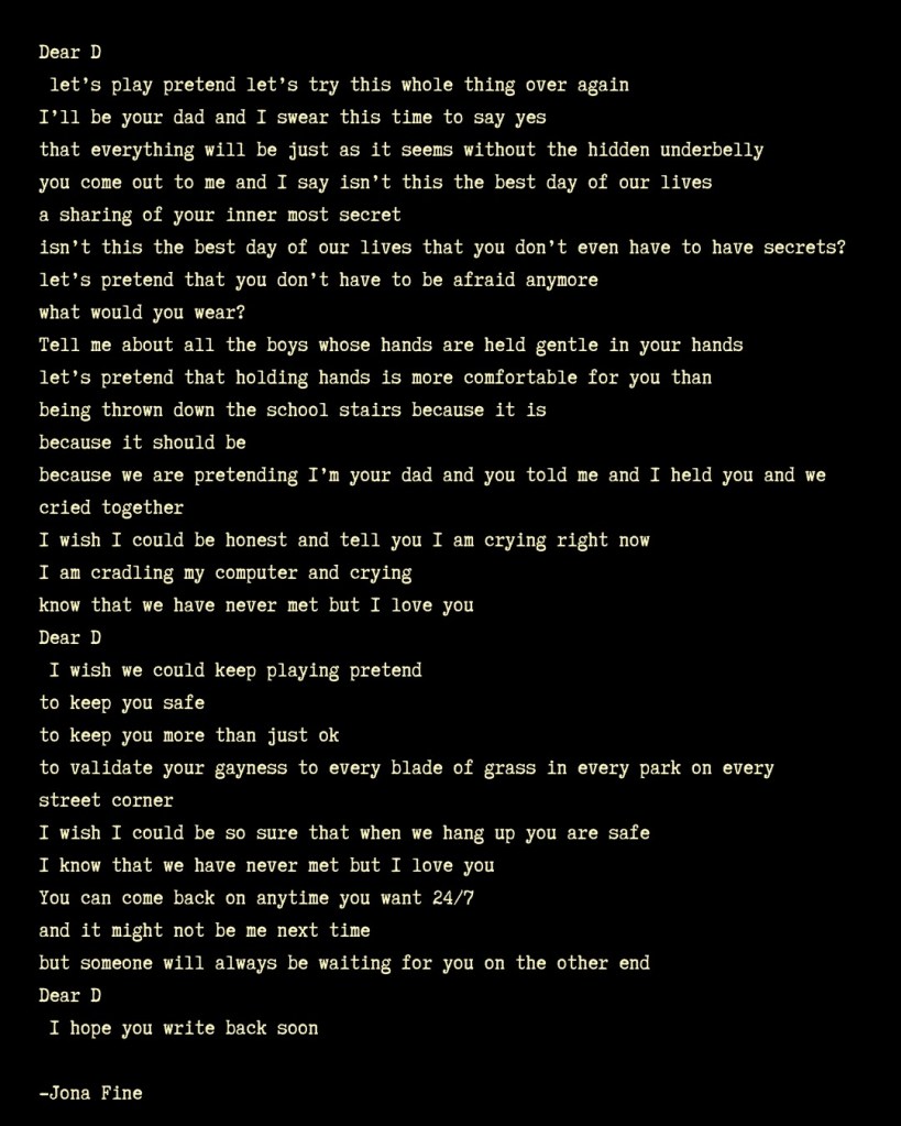 The poem Jona shares with us here is part of a new collection of letters to LGBTQ+ youth. These are youth Jona works with while many of them are in their darkest moments, often in states of nearing self-harm, isolation from family, and confusion in finding who they are. Jona talks, with them over text, as part of a hotline providing resources to these struggling young people, on a journey to find their way. Jona reassures them, offers resources, does what is clinically possible. But at the end of day, Jona doesn’t get to find out what happens to them, nor to share the true heart stories one would share with a friend. The poem you are about to read is a letter to one of these youth. ‘D’ is one of many thousands of LGBTQ+ youth who are struggling to find their way in an increasingly confusing world. Jona’s work highlights how each of us can be a friend to those in our lives struggling in these ways. I hope you can hear the fierce heart of courage in these words, can see a piece of Open Circle. As I write this with tears in my eyes, I know that I have.