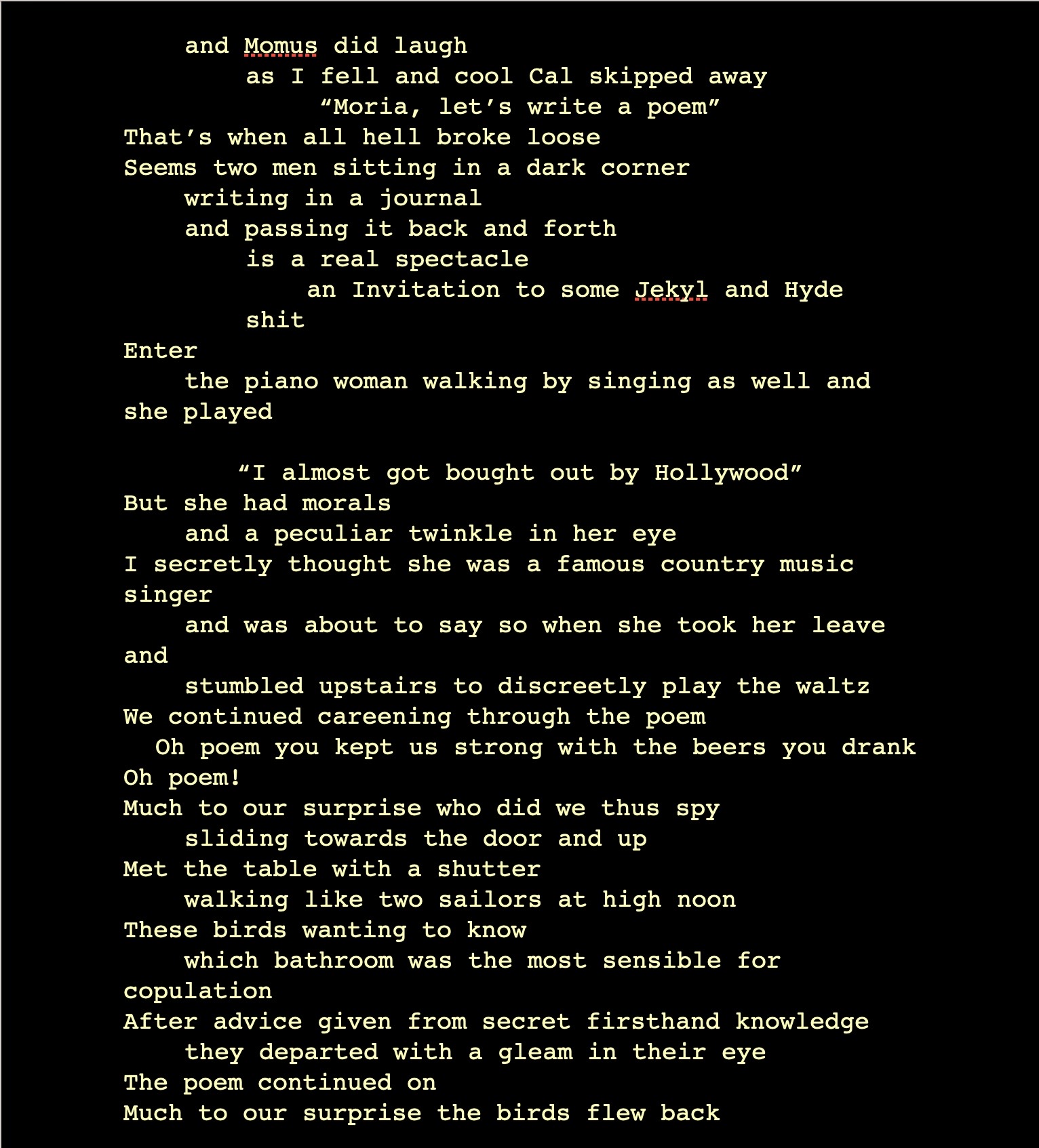 I’m not going to waste any word count pointing out what makes this poem especially better or not better than any of the other stuff I count myself lucky enough to have been around to hear Tundji read on stage back in his Boulder days. It’s a poem. When you read it yourself, you’ll like what you like about it. One thing I will say about Momus & Moria, in my best Han Solo cameo/role-reprising The Force Awakens tone of voice; “It’s true. All of it. The Force/Cool Cal. The Jedi/Un-copulating Couple. All of it.”