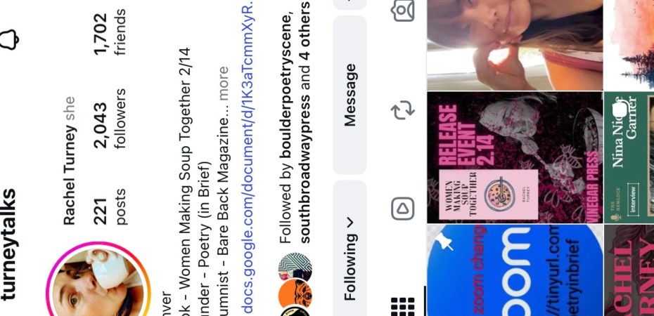 Turney has never met any of these poets in real life, yet they’ve quickly become some of her closest friends and most loyal supporters. What began as cold call DMs and out-on-a-limb feature invitations, has now become something much deeper. She estimates she nows ‘talks to 10-15 poets a day’ thru social media, video conferencing, and phone, having conversations about editing, hosting, and publishing, but even just how’s-life-been-going chitchat. She’s also made a long term ‘writing buddy’ with whom she meets regularly to exchange work virtually, and even recently wrote a letter of recommendation for her, just like she would do for one of her in person ‘flesh friends.’