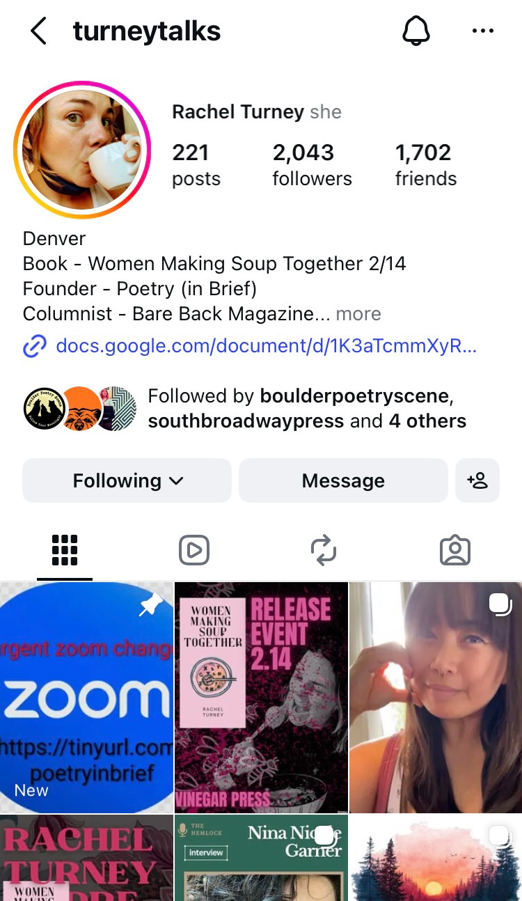 I suppose the thing that initially caught my attention about Turney, was simply the fact that she wrote about other poets’ work, which is a core facet of the Boulder Poetry Scene project but hasn’t always been easy to scrounge up from people lately. Turney has a background in journalism, and regularly writes reviews, interviews, and reporting on various poets and publications which interest her. On her Instagram account (@turneytalks), she posts mini-write ups she calls ‘Thumps.’ A self-described ‘short writer,’ Turney’s work has always tended to be concise, which just happens to align well with today’s social media formats and audience attention spans, (unlike how many words is this?).