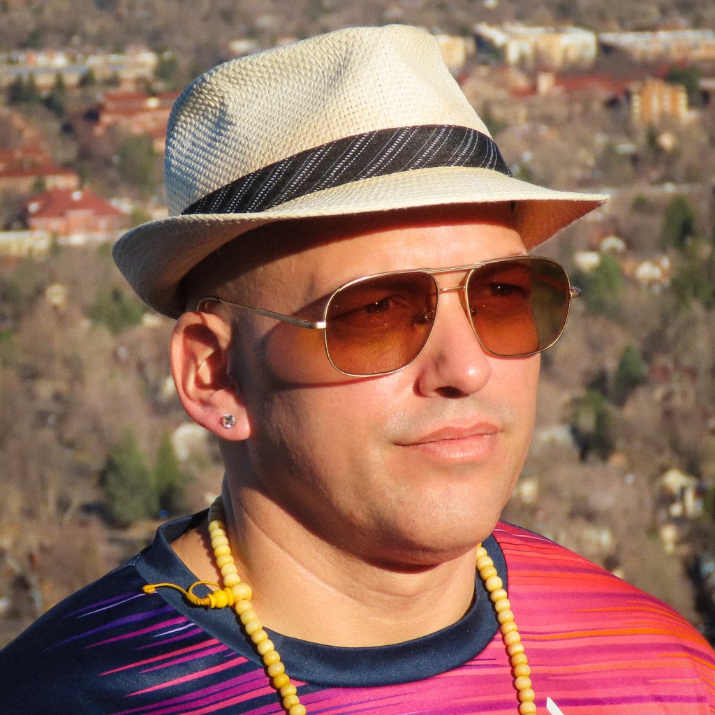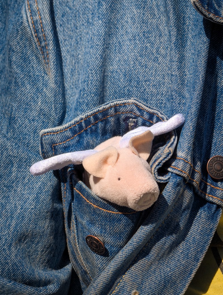 Black bandana, transition aviator glasses, Levi’s denim jacket w/ Folkmanis finger puppet American Robin and winged pig, yellow Boulder Poetry Scene t-shirt, jeans, black Nikes