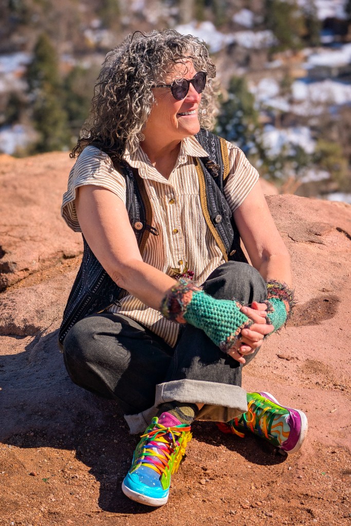 Wearing my “poetry shoes” that were a gift from CU Conference Services upon my retirement/rewirement in 2025. One is day, one is night and decorations include horses, bees, mountains, ocean, and flowers, including a sunflower!