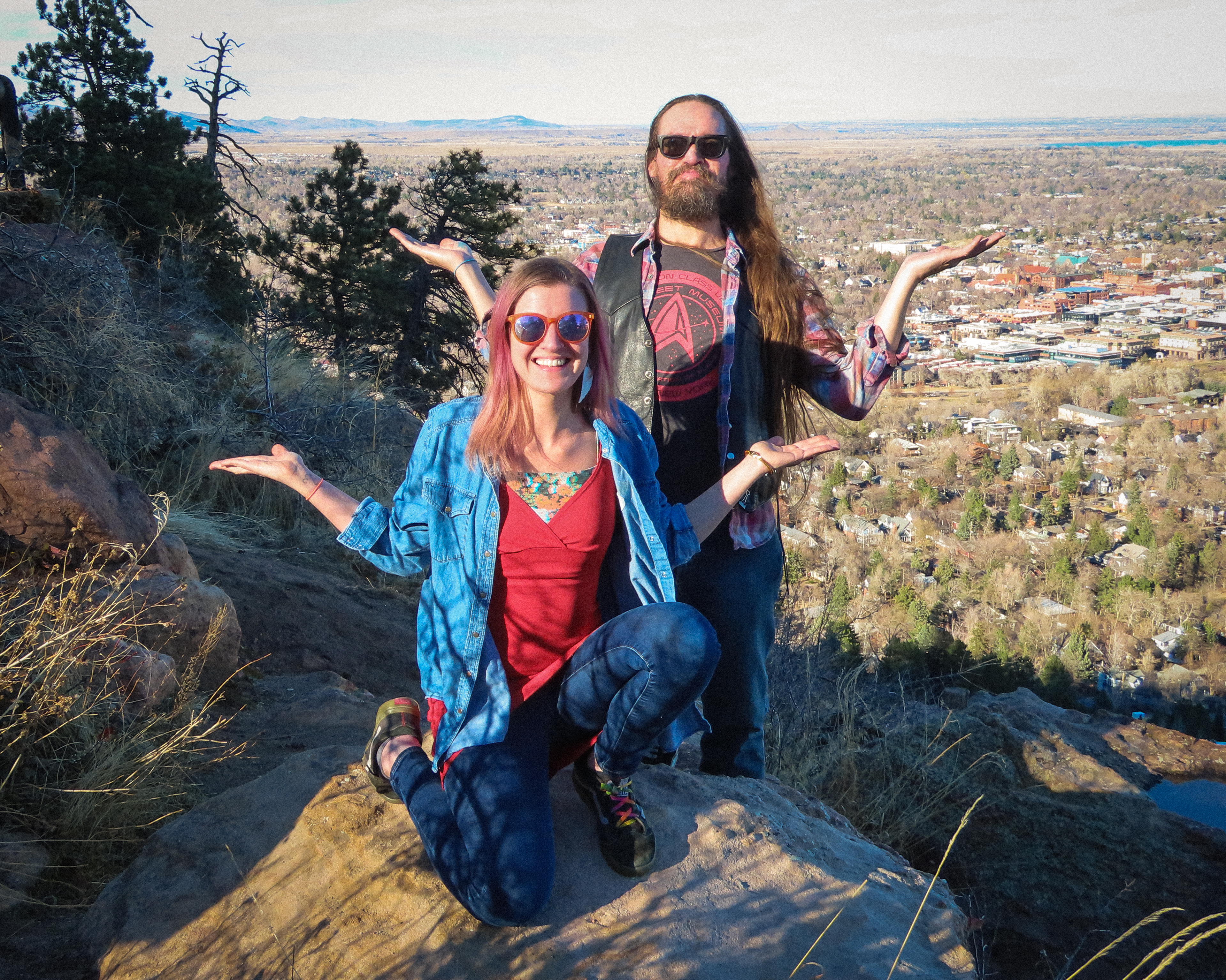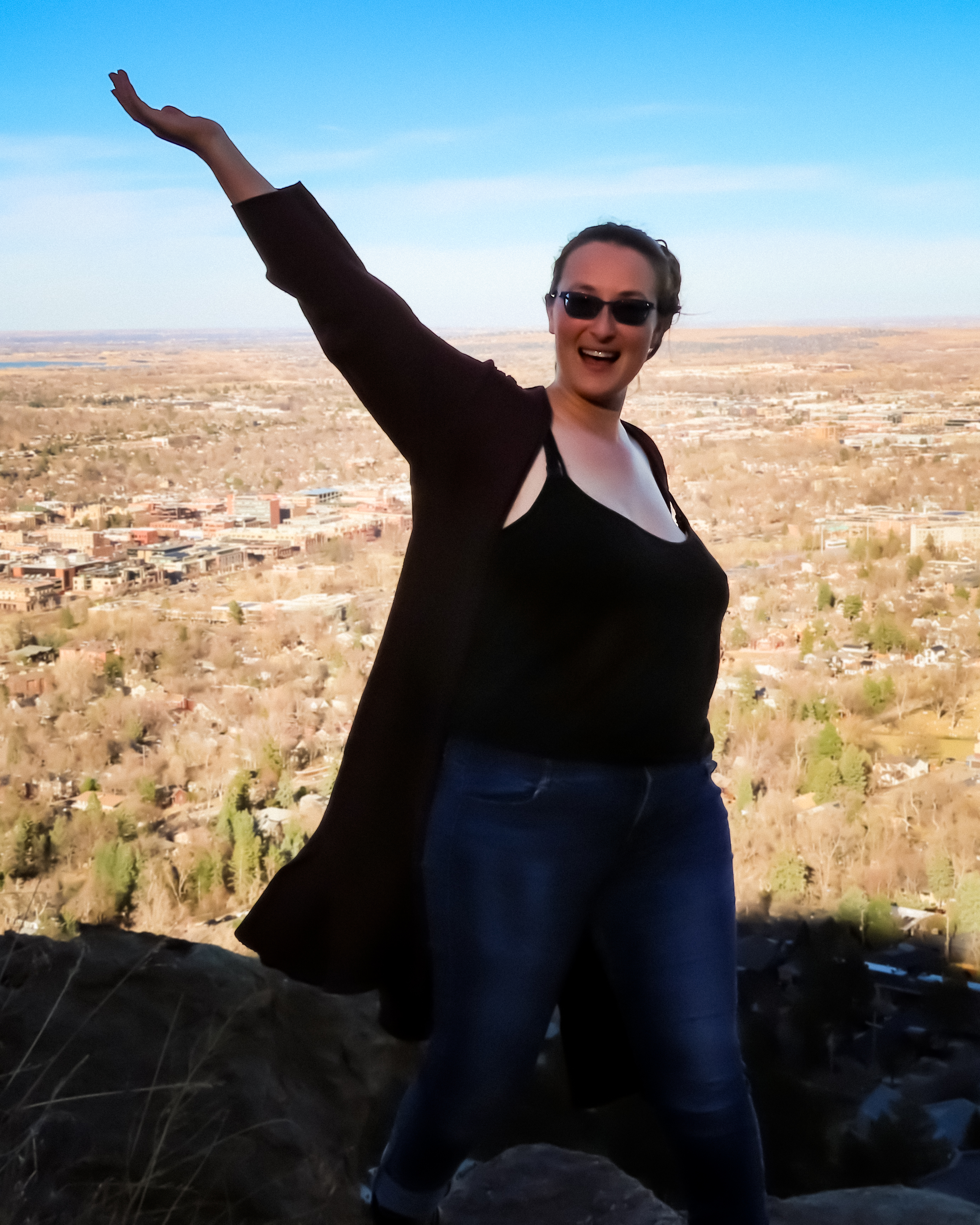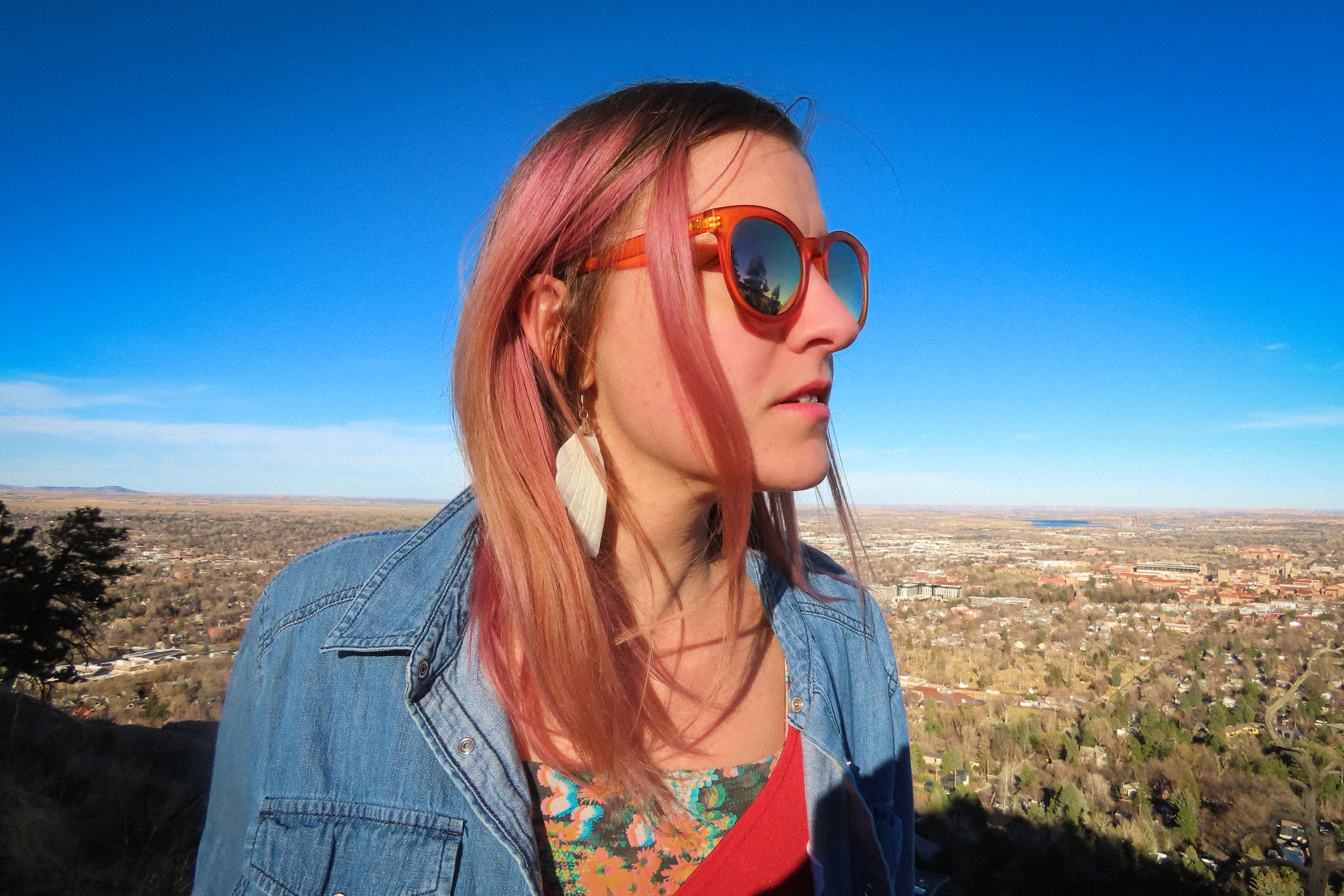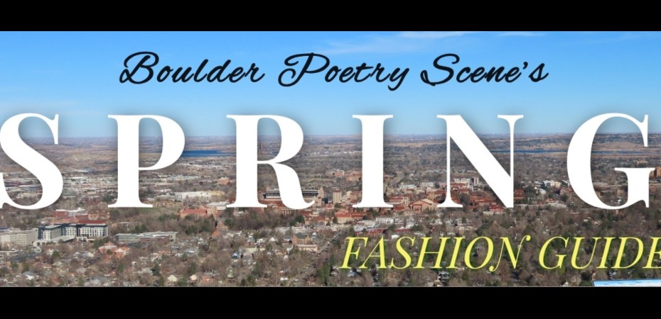 In early March we went up to the Flagstaff Overlook in Boulder, otherwise known as Panorama Point, on the day after like the only time it’s snowed this year. As with any attempted organization of poets, fate decided who would actually show up for the shoot. Luckily fate came thru and delivered 9 of our snazziest dressers in the scene. It was a two day shoot with photographer Andrea Becker gracing us with her talent and expertise the first day, and me following up the next day, scrounging up anyone who was willing from that month’s BAFS Second Sunday class at the library and doing my best with non-avian subjects as the sun set rapidly over the Flatirons. But no matter what amateurism I brought to the table, Andrea was able to salvage it later with her super pro editing skills, and so here ya have it – your guide to what to wear this spring, with a little expository flavor from each of the featured poets…