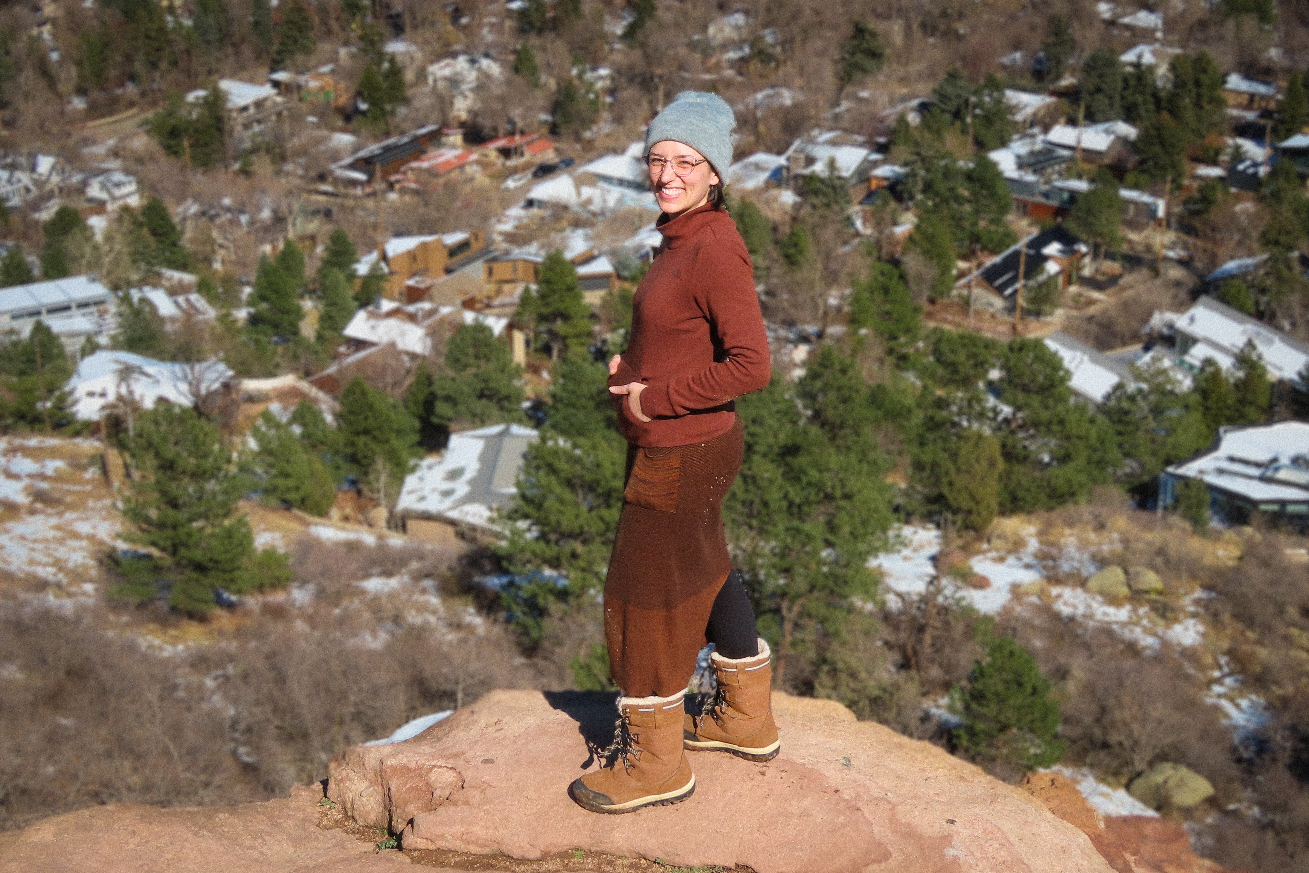 Brown knit skirt, wool-lined Bearskin boots, brown Northface pullover with a nice big pocket, and warm hat