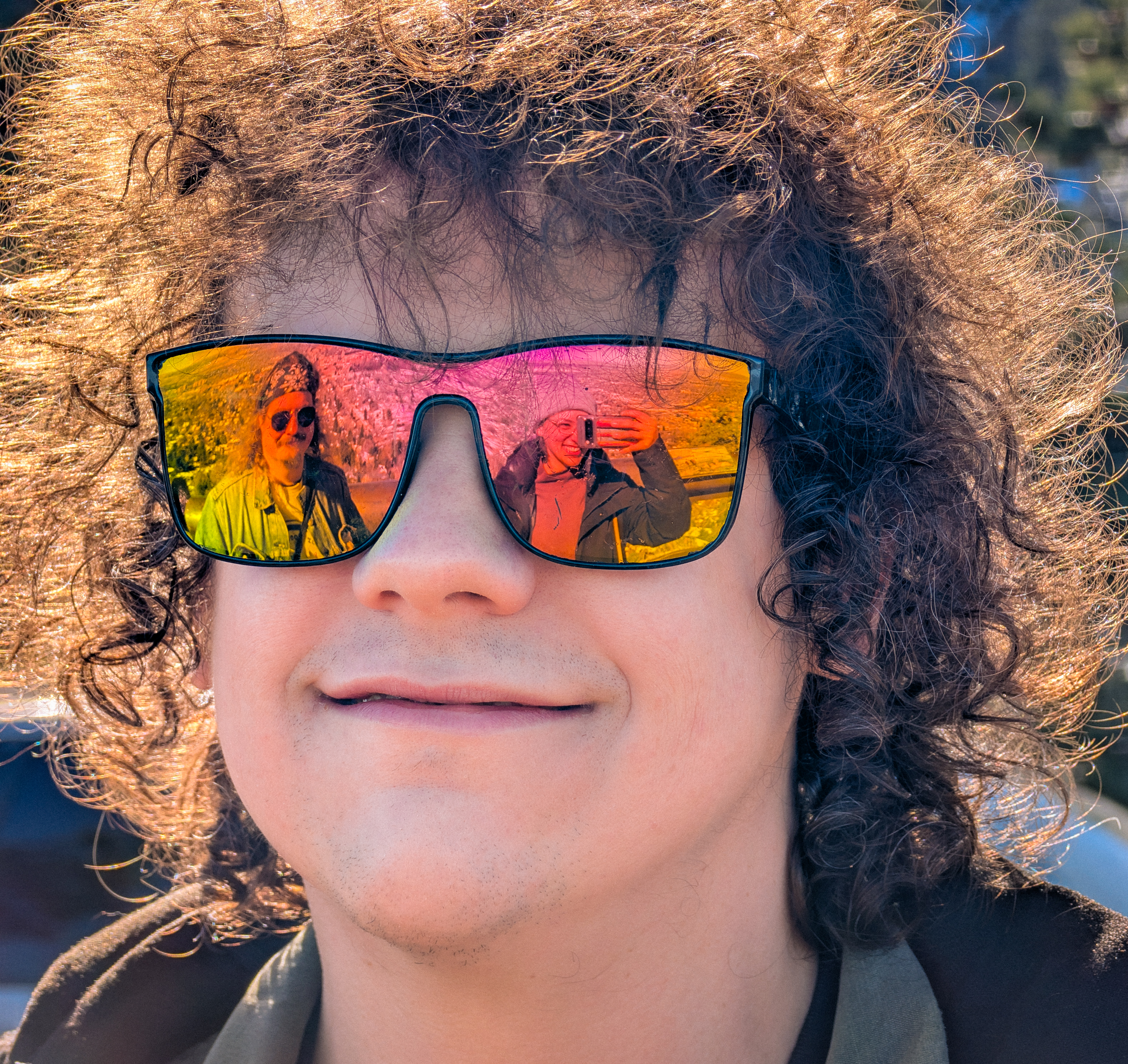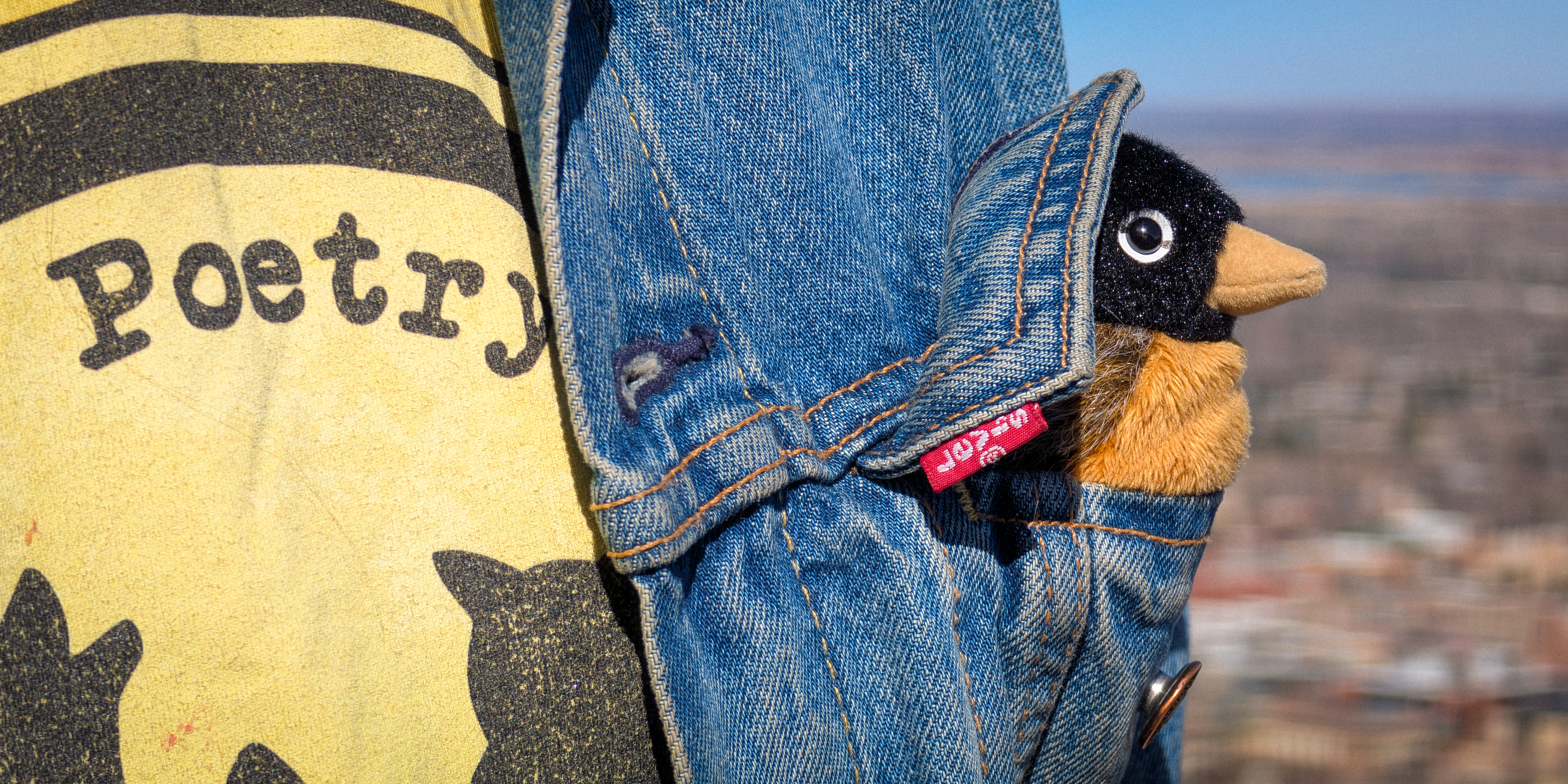 Black bandana, transition aviator glasses, Levi’s denim jacket w/ Folkmanis finger puppet American Robin and winged pig, yellow Boulder Poetry Scene t-shirt, jeans, black Nikes