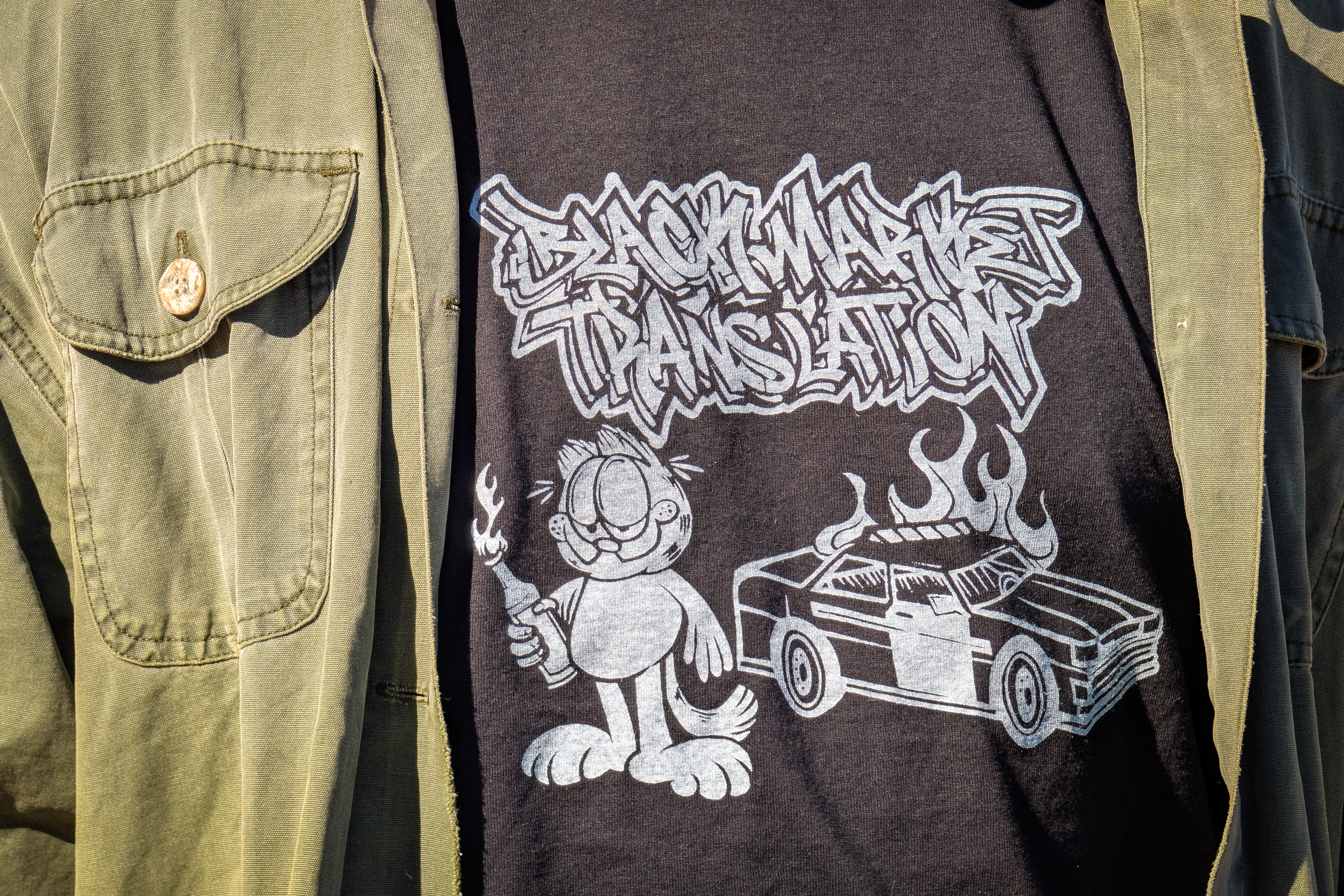 This fetching ensemble consists of the latest in Black Market Translation fashion designed by the inimitable Chris Eason and featuring Garfield going all Monday on a motherfucking cop (on sale now), paired with my undecorated veteran overshirt (more on that below), atop the classic black jeans and Vans look I have been rocking since doing it once as a teenager and nobody said anything