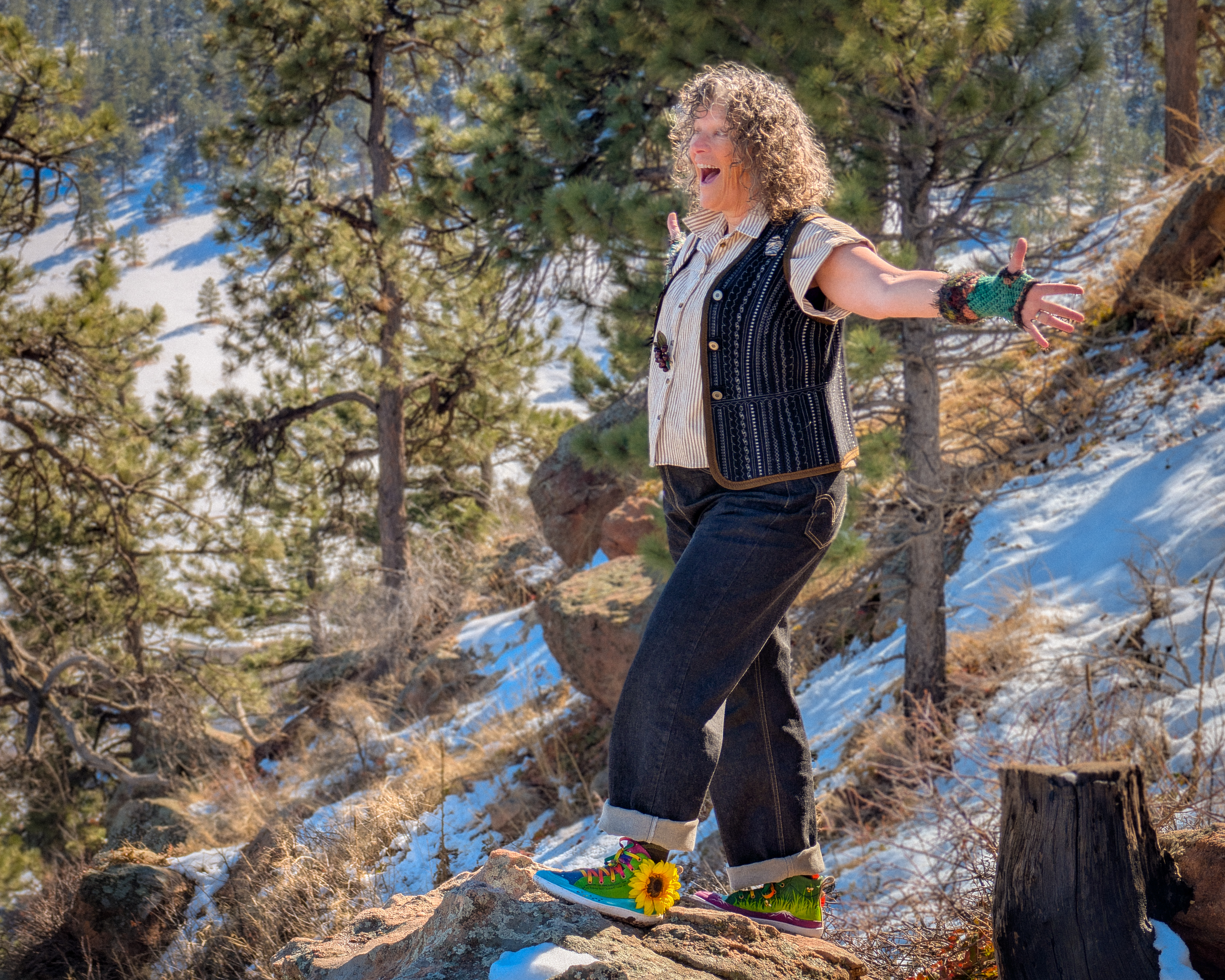 Wearing my “poetry shoes” that were a gift from CU Conference Services upon my retirement/rewirement in 2025. One is day, one is night and decorations include horses, bees, mountains, ocean, and flowers, including a sunflower!